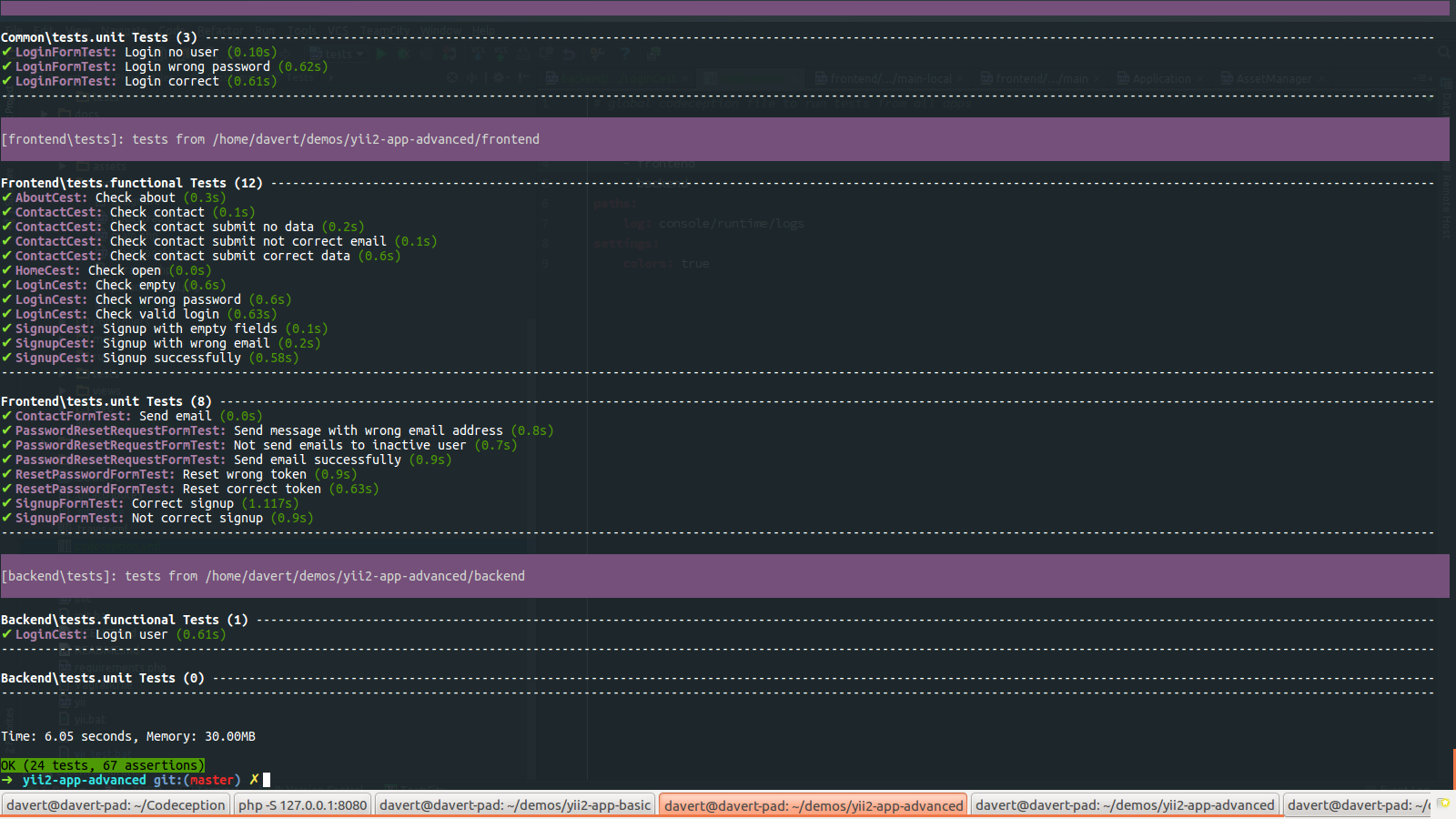 Advanced template also has Codeception preinstalled with examples of unit, functional, and acceptance tests. However, you won’t find tests folder in a root of application. This because every application frontend, backend, and their common has their own tests. This is done to have tests and source to be placed in a same location. To run all tests from all application at once, you should execute codecept run from a project root. Global codeception.yml config was written to include tests from all applications.
